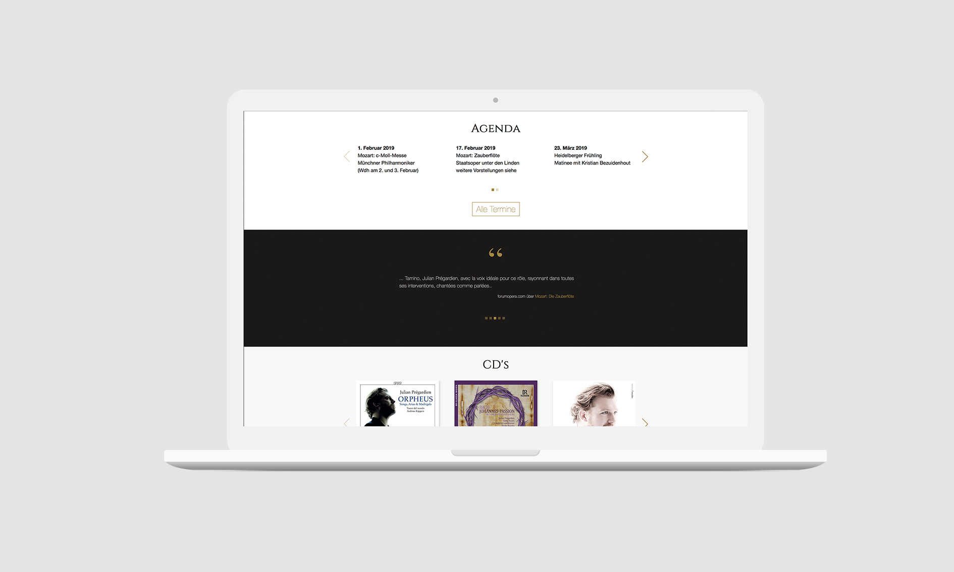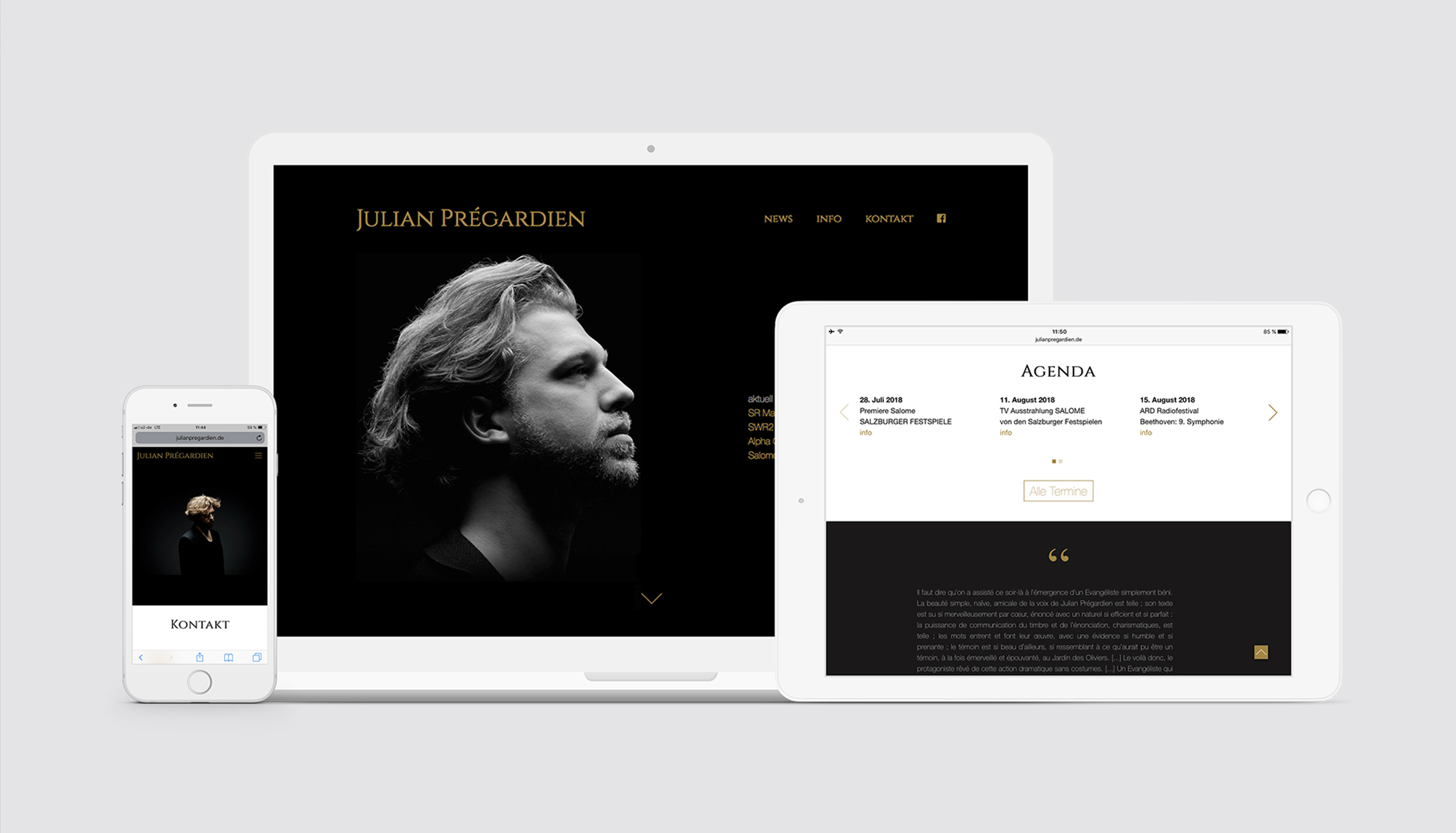 Julian Prégardien ist ein lyrischer Tenor, der bereits mit jungen Jahren auf den großen Bühnen der klassischen Musikszene zu Hause ist. Wer sängerisch so überzeugt wie er, benötigt für seinen Marketingauftritt nicht mehr als eine Homepage. Deren Betreuung liegt in unseren Händen.