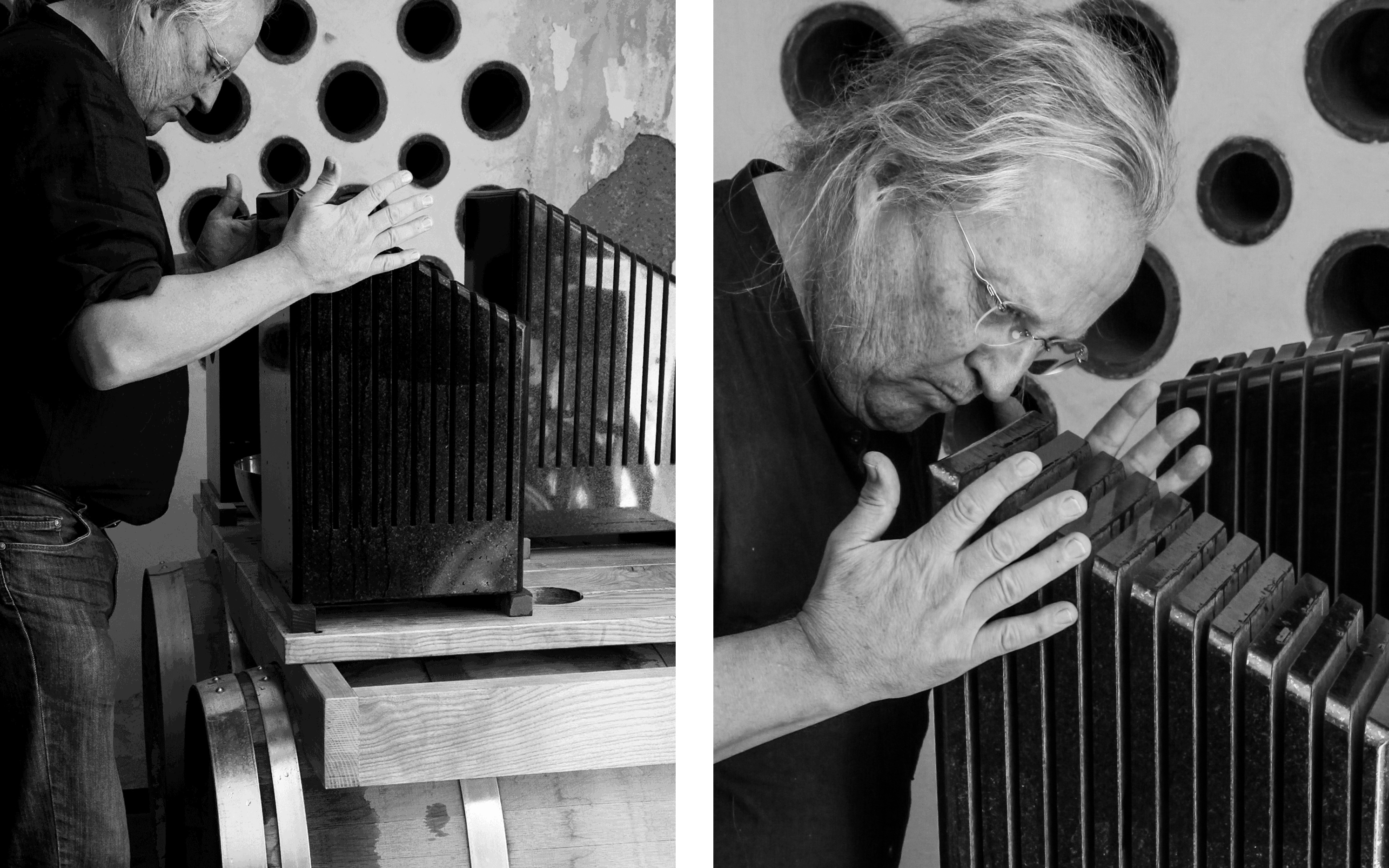 Prof. Klaus Fessmann beschäftigt sich seit vielen Jahren mit Klangsteinen, entwickelt neue Formen, gibt Konzerte und erforscht ihre Wirkung. So wurde die Idee geboren, die Entwicklung von Wein unter dem Einfluss des Klangsteins zu untersuchen. Mit Ronny Kiss, einem renommierten und erfolgreichen Winzer aus dem Burgenland war ein Topwinzer gewonnen, der seinen besten Rotwein zur Verfügung stellte. Das Ergebnis war so bemerkenswert, dass der bespielte Wein in einer eigenen Abfüllung ediert wurde.